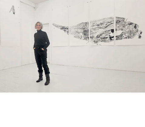 Listakvinnan hevur seinastu árini arbeitt við sporum av stórum og smáum djórum, sum verða sett á koparplátur, ið eru frammanundan viðgjørdar. Listakvinnan nevnir sín arbeiðshátt fyri feltgrafikk. Samstarv millum listakvinnuna, Steinprent, Dorethe Bloch, professara, Biofar og koparprentaran Mette Marott førdi til í fjør, at fótafarið av einum stórum grindahvali varð sett á koparplátur, sum síðan vórðu viðgjørdar, etjaðar og prentaðar. Á framsýningini verður eisini eitt stórt koparprent at síggja við fótasporum av teimum mongu luttakarunum í verkætlanini. >